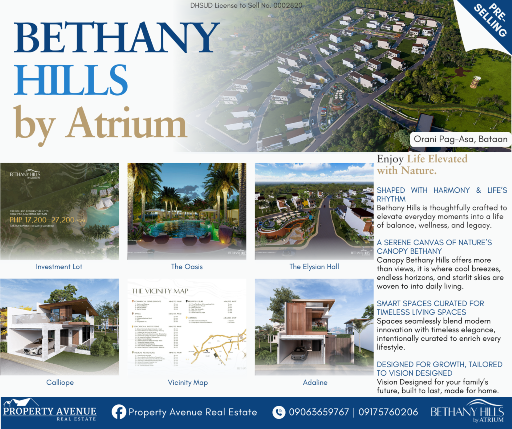 Experience a new standard of living at Bethany Hills by Atrium, a 10.3-hectare master-planned residential community nestled at the peak of Brgy. Pag-Asa, Orani, Bataan.